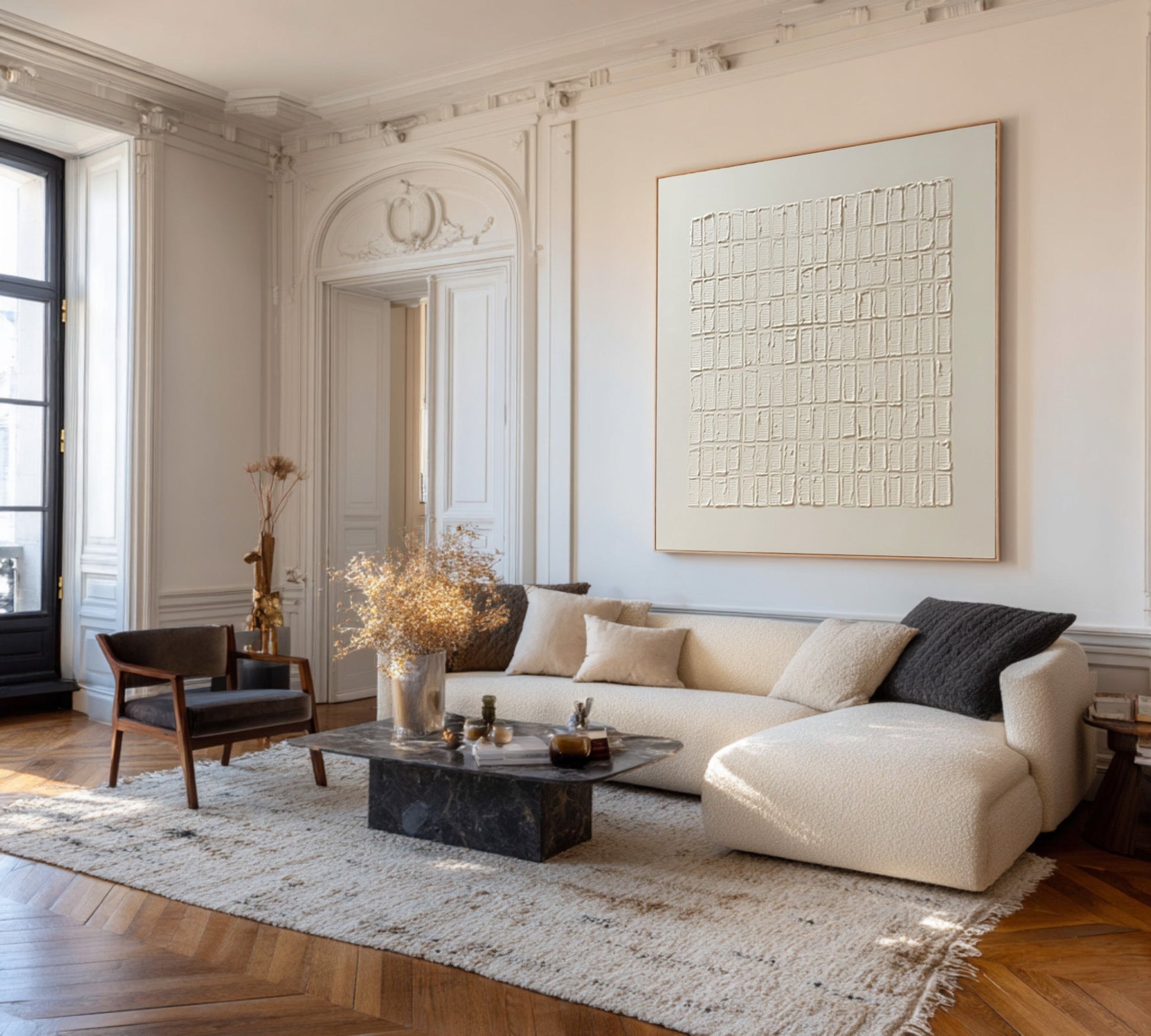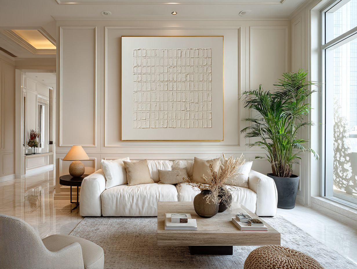 As a piece of Minimal Grid Texture Art, it expresses calm rhythm and quiet order. The restrained palette and tactile surface define it as a refined White Textured Abstract Painting, ideal for modern minimalist, wabi-sabi, and contemporary interior spaces.