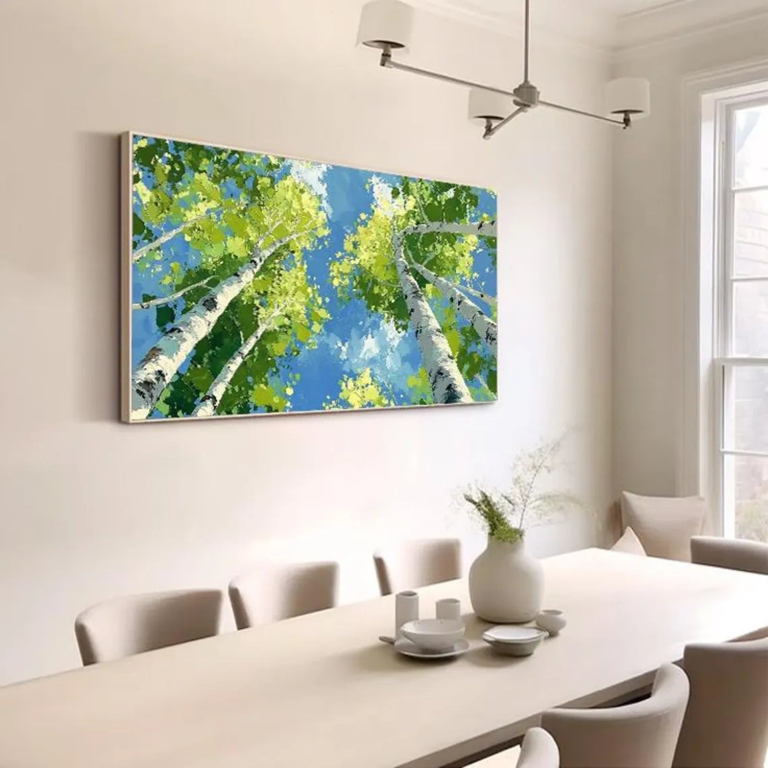 This artwork captures an upward view of a birch forest canopy, where slender white trunks rise toward a vivid blue sky and vibrant green leaves shimmer with light. Expressive, layered brushstrokes create a sense of openness and vertical movement, inviting the viewer to pause, breathe, and reconnect with nature.