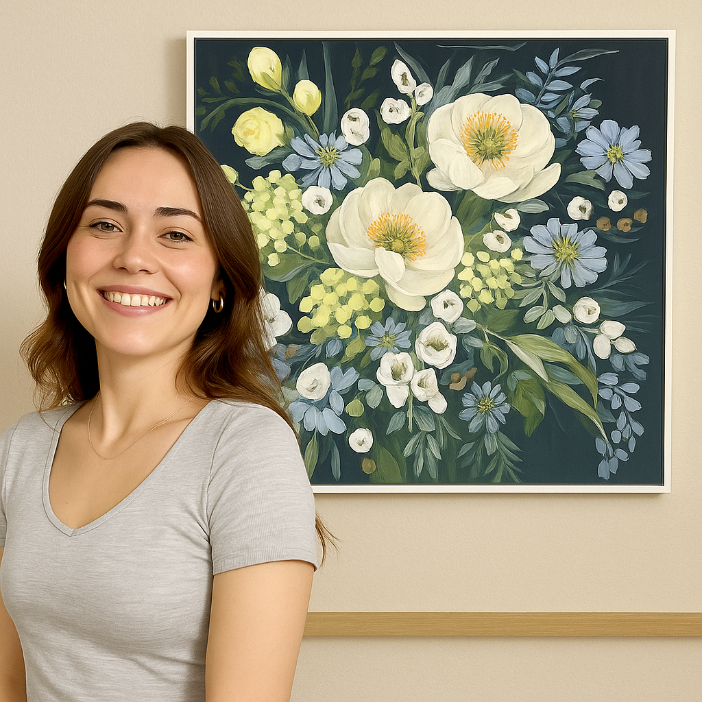 Delicately painted in watercolor, the floral bouquet exudes fresh elegance and a dreamlike charm, perfect for bedrooms or cozy corners.