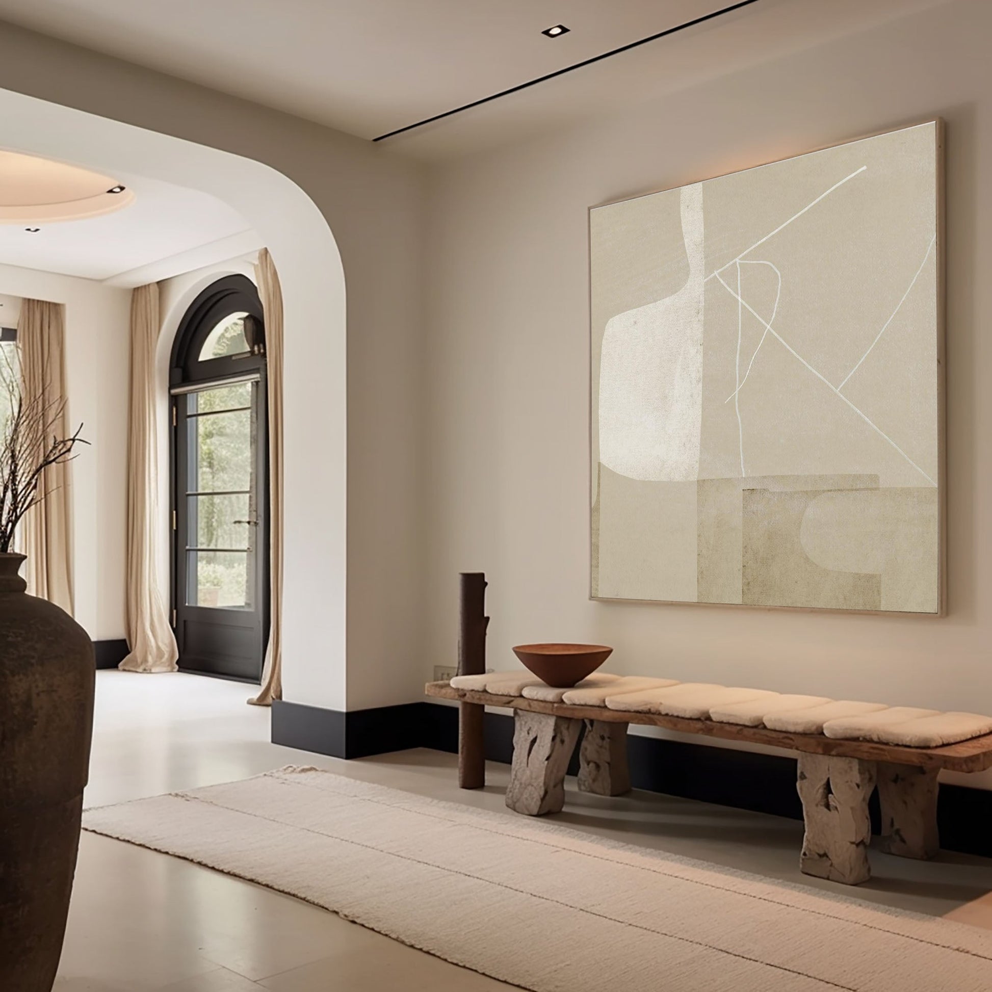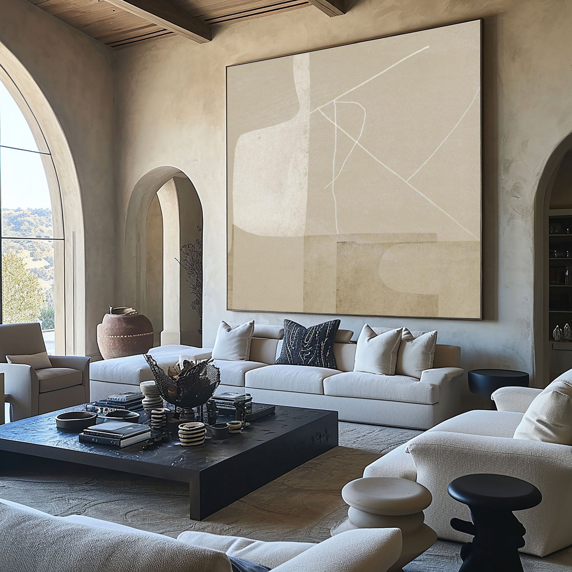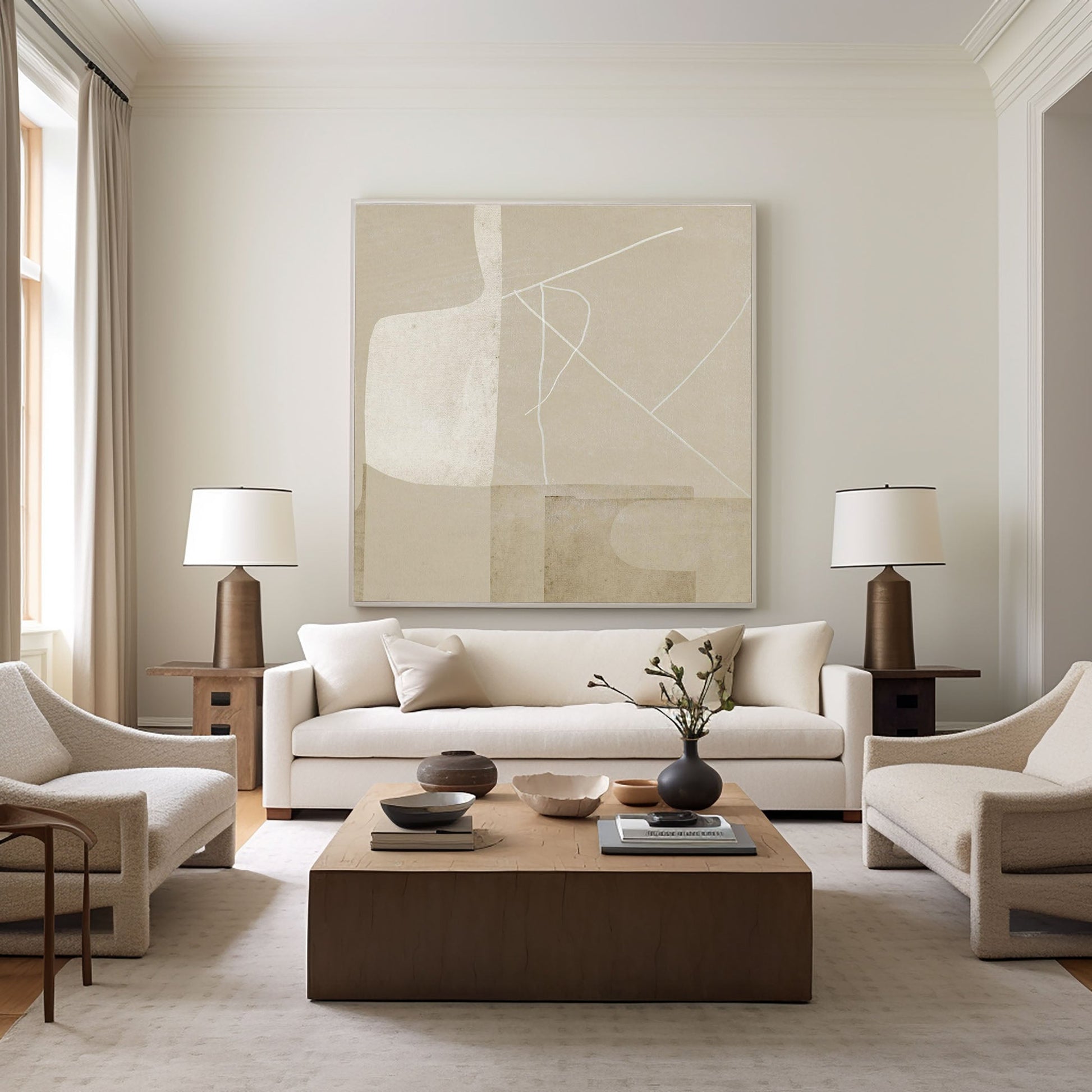 A calming composition of flowing shapes and quiet lines defines this soft taupe abstract painting. The neutral palette of beige, cream, and sand creates a warm and understated presence, while delicate minimal linework adds a sense of motion and intention. A versatile artwork that blends gracefully with Scandinavian, Japandi, and modern interiors.