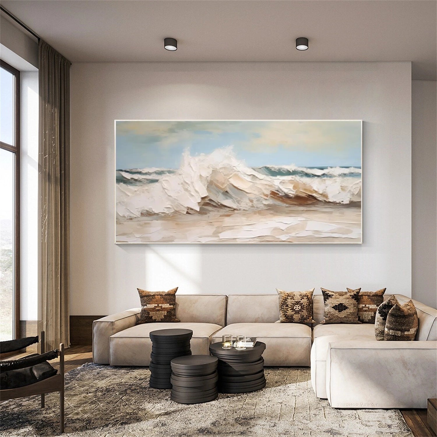 This artwork captures the quiet power of rolling waves through rich, textured brushstrokes. Soft sand tones, creamy whites, and muted blues blend seamlessly, evoking the calm of a peaceful shoreline at dawn or dusk.