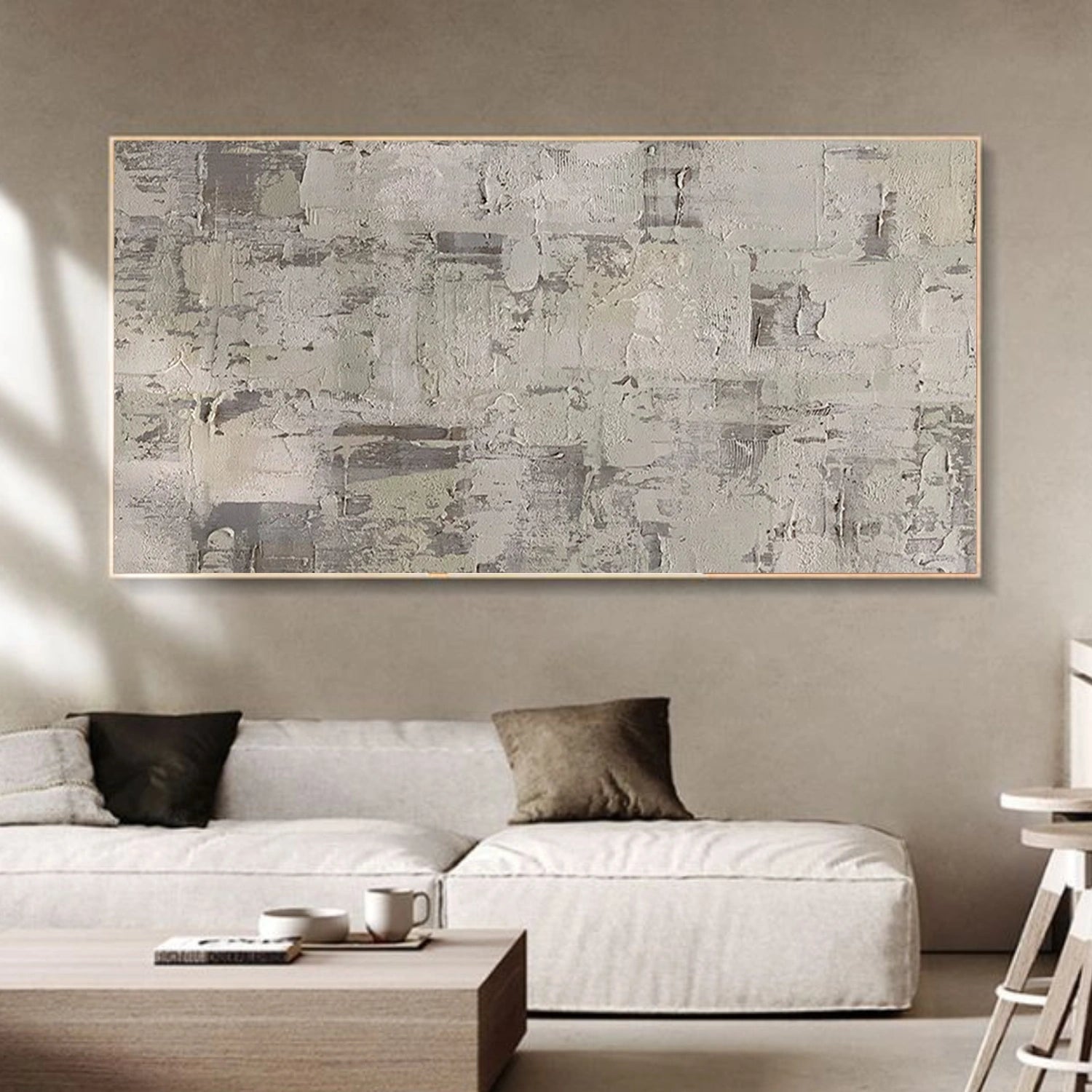 This contemporary abstract painting presents a calm interplay of soft greige, warm beige, and muted stone tones, layered with expressive palette-knife textures. The surface reveals subtle blocks and scraped marks, creating a tactile rhythm that feels architectural yet organic.