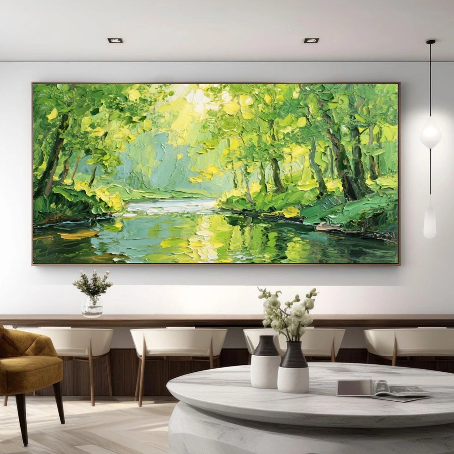 Ideal for wide walls in living rooms, dining areas, or above sofas, this piece brings freshness and balance to interior spaces. As a panoramic forest river painting, it immerses the viewer in calm natural scenery, while its bold texture and color make it a distinctive lush green landscape wall art that energizes modern and nature-inspired interiors.