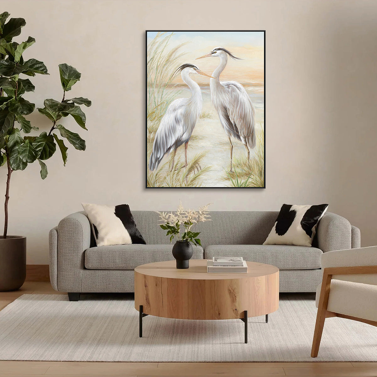 This serene hand-painted artwork depicts two elegant herons standing gracefully by the shore, framed by soft reeds and the gentle glow of a sunset. The delicate brushstrokes highlight the birds’ poised figures, while the muted natural tones create a calming and sophisticated ambiance. Perfect for living rooms, bedrooms, or coastal-inspired interiors, this piece brings a sense of harmony and timeless beauty to any space.
