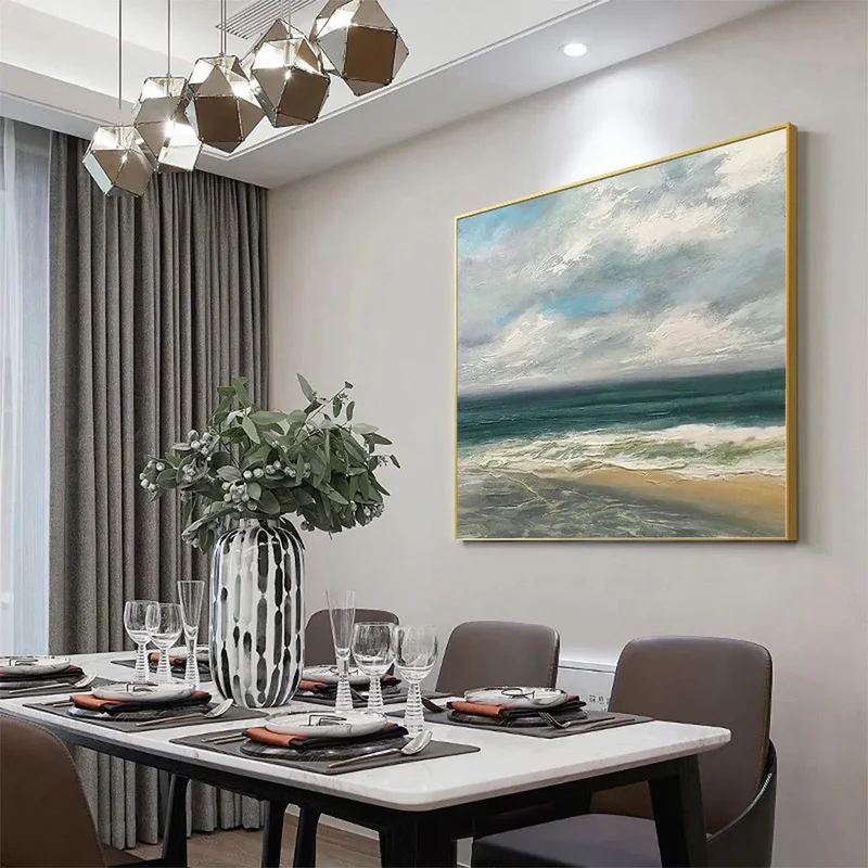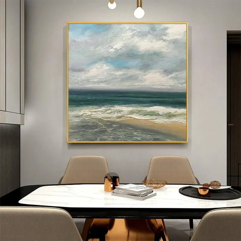 This tranquil ocean view painting captures the peaceful rhythm of waves as they meet the sandy shore beneath a soft, misty sky. Layered tones of deep teal, gentle white, and mist-gray clouds create a deeply calming seascape that feels both expansive and intimate. The artist’s textured brushwork brings the tide to life, evoking the soothing sound of waves and the refreshing breath of coastal air. Ideal for living rooms, bedrooms, and meditation spaces, this artwork introduces calming depth and coastal serenity, transforming your home into a peaceful retreat.