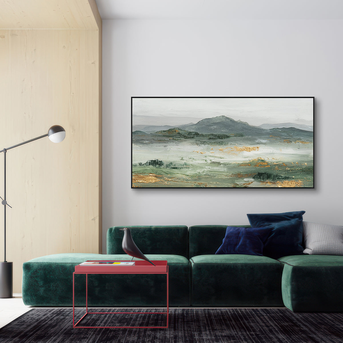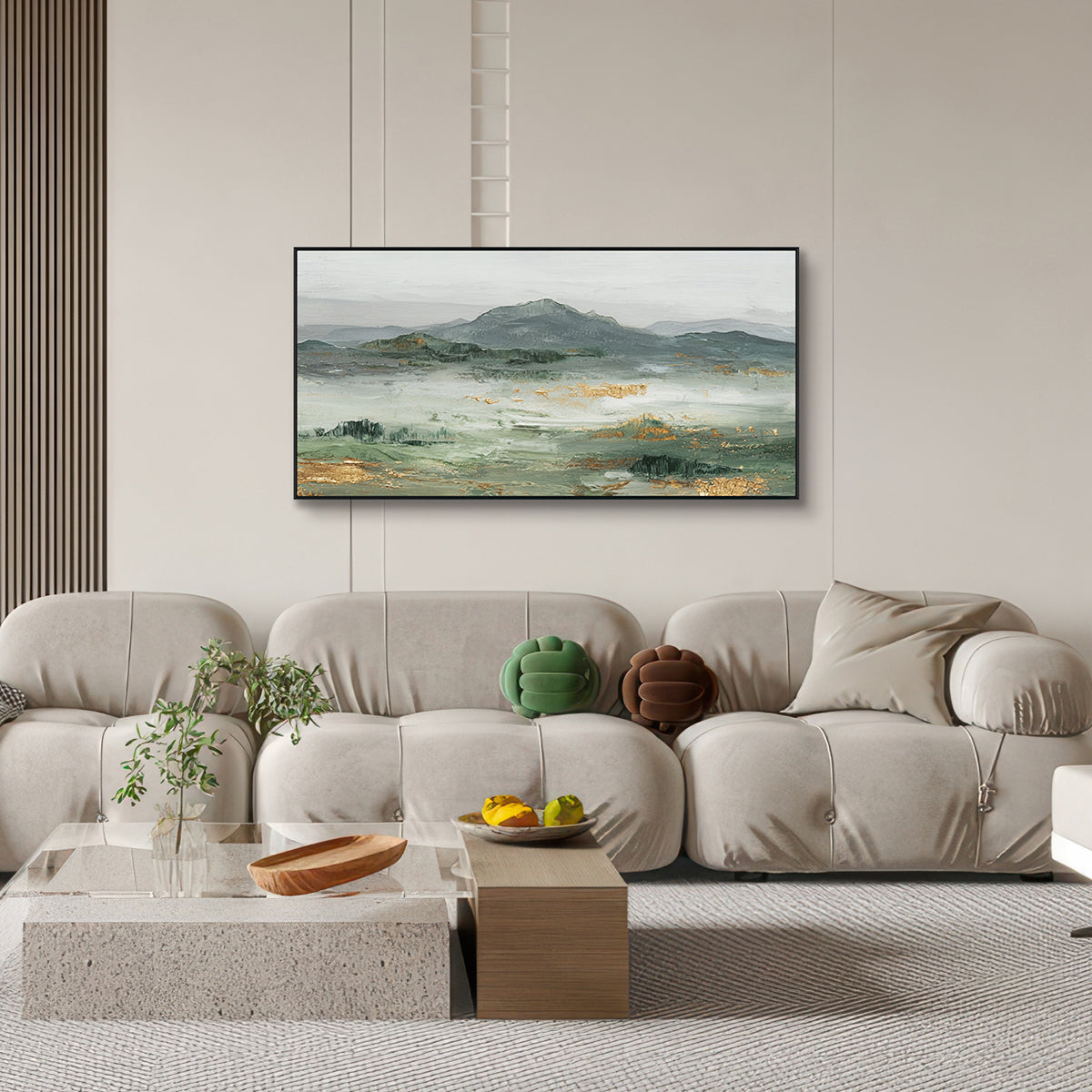 “Whispered Peaks” evokes the tranquility of mist-covered mountains bathed in soft light and subtle earthy green tones. The artist skillfully blends layered strokes of sage, gray, and gold to create a poetic depth — where mountains fade into serenity and the horizon breathes calm. This elegant textured landscape painting brings a meditative presence to modern spaces, making it ideal for minimalist, wabi-sabi, or nature-inspired interiors. Each stroke carries the essence of quiet strength and timeless grace.