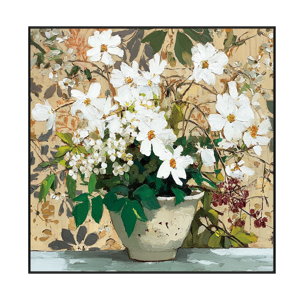 This white floral still life painting captures the quiet poetry of blooming flowers in a soft ceramic vase. The artist uses thick impasto textures and gentle light to highlight the purity and calm beauty of each petal. The warm beige background with subtle botanical patterns adds vintage charm, making it ideal for romantic, farmhouse, or modern classic interiors.