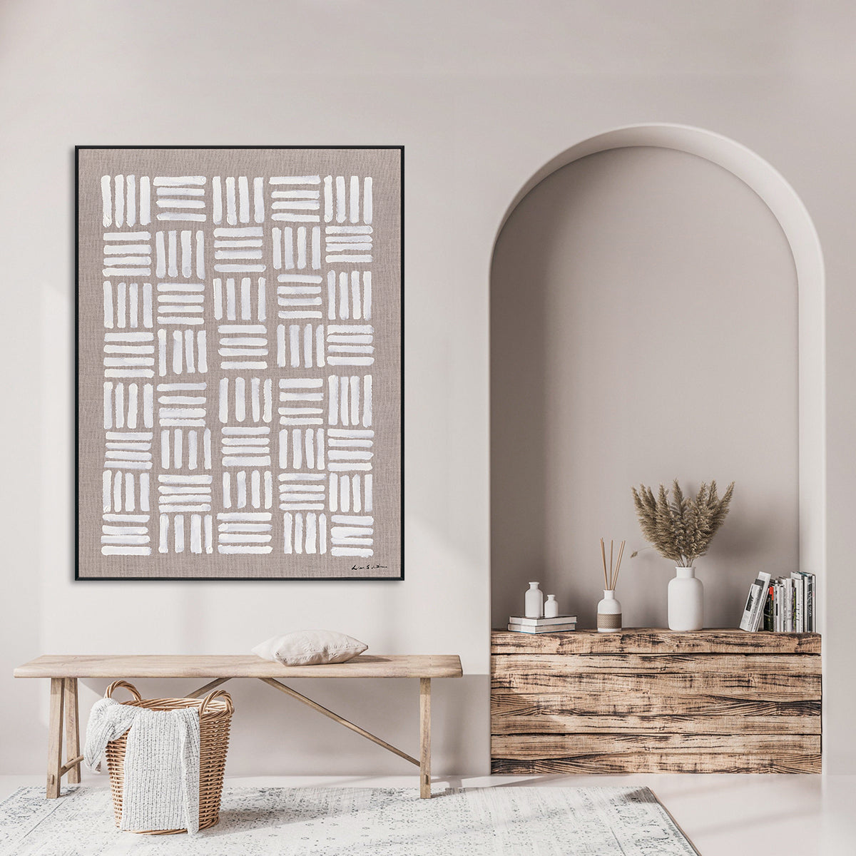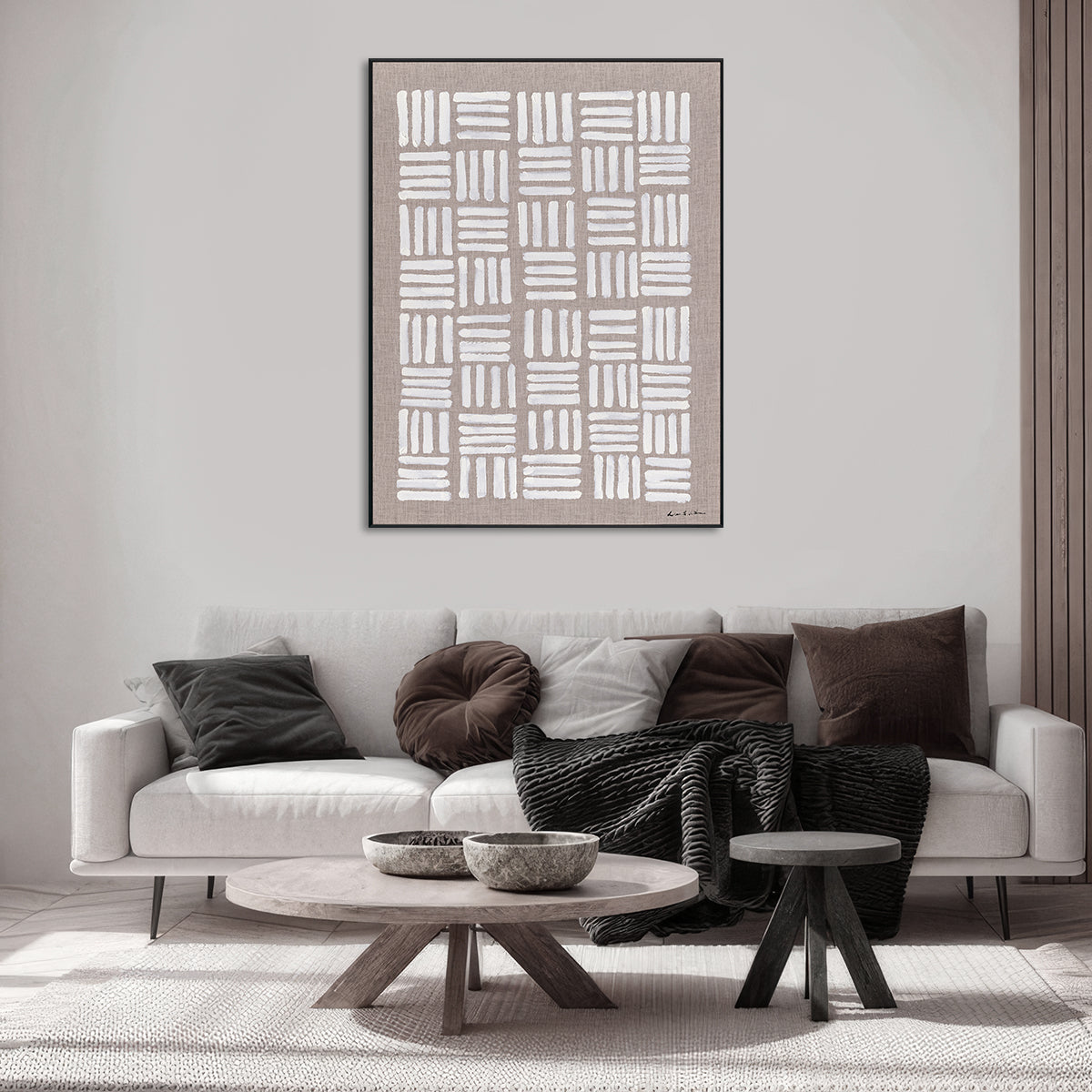 Structured white strokes repeat across a linen backdrop, embodying pure order and minimal balance.