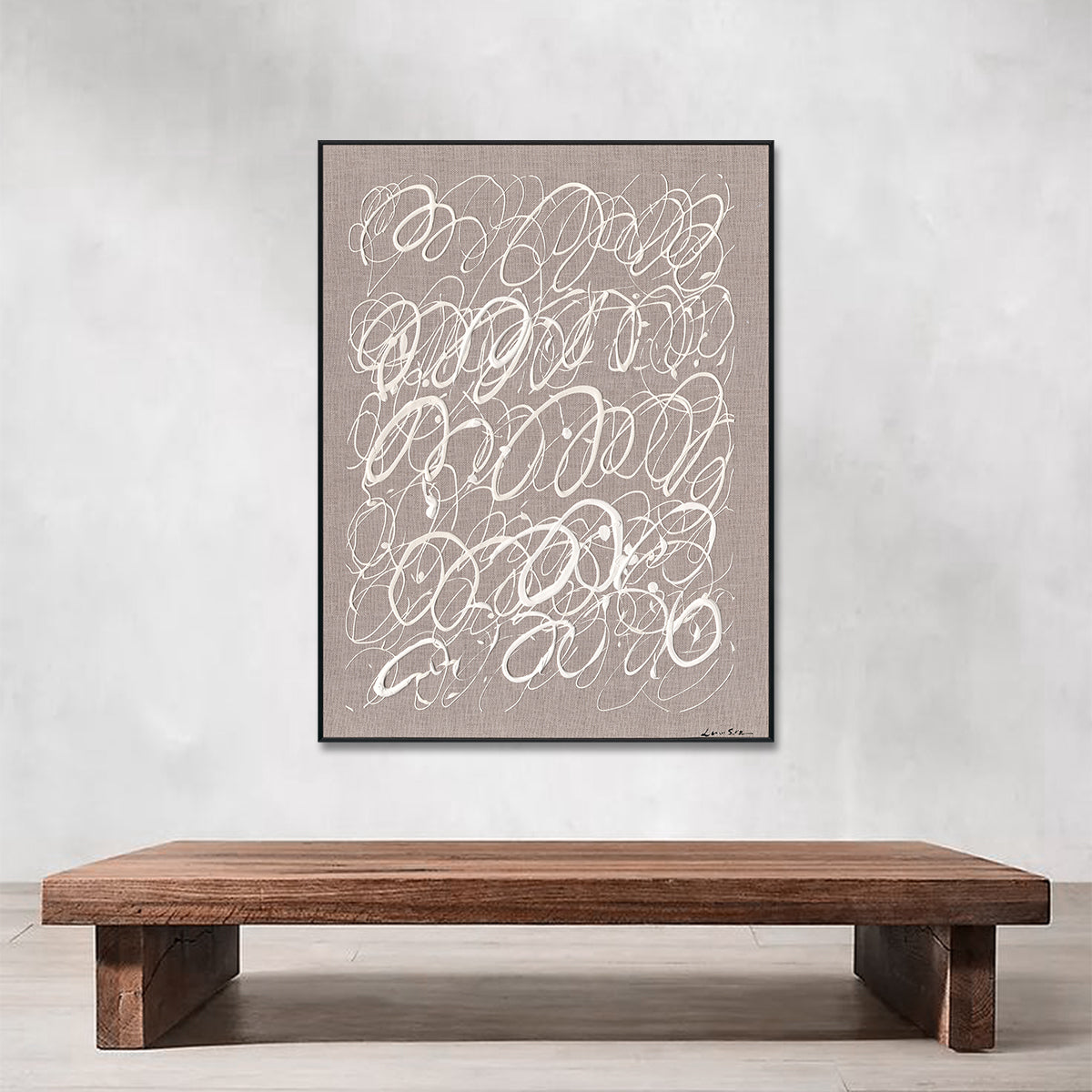 Free-flowing white curves dance across the canvas, expressing rhythmic inspiration and abstract poetry.