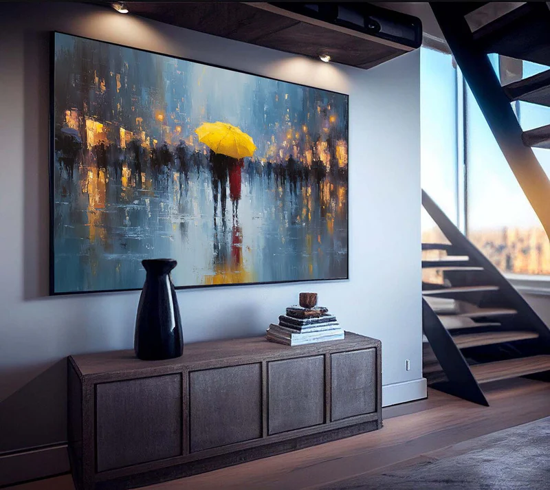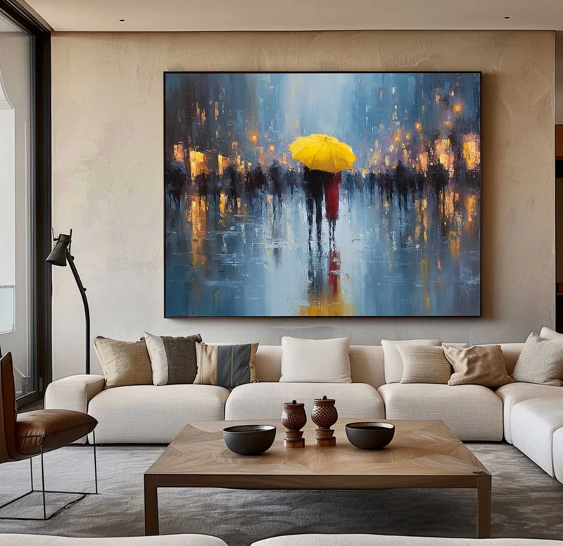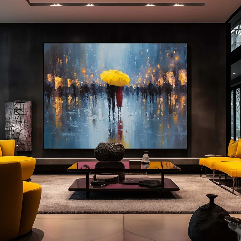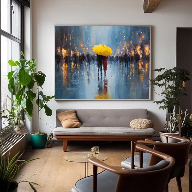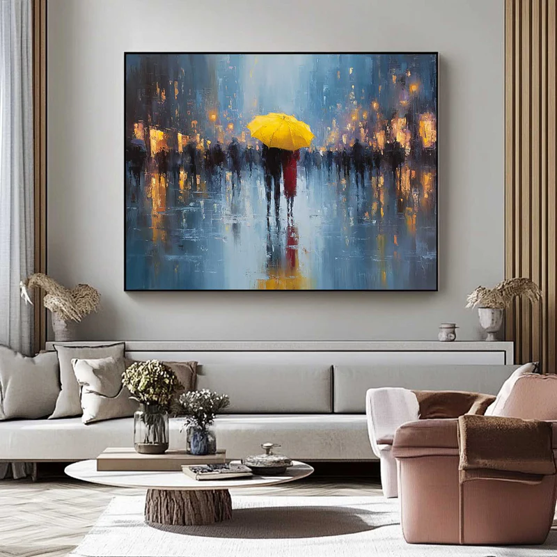 This yellow umbrella rainy street painting captures a poetic moment in the heart of a rainy city. The lone couple stands beneath a bright yellow umbrella, glowing against the deep blues and shimmering reflections of the wet street. Warm lights from surrounding buildings softly illuminate the scene, creating a balance between urban energy and intimate quietness. With expressive palette-knife strokes, the artwork evokes emotion, warmth, and a sense of storytelling. Ideal for living rooms, bedrooms, hallways, and modern interiors, this piece adds romantic city ambiance and atmospheric glow to your space.